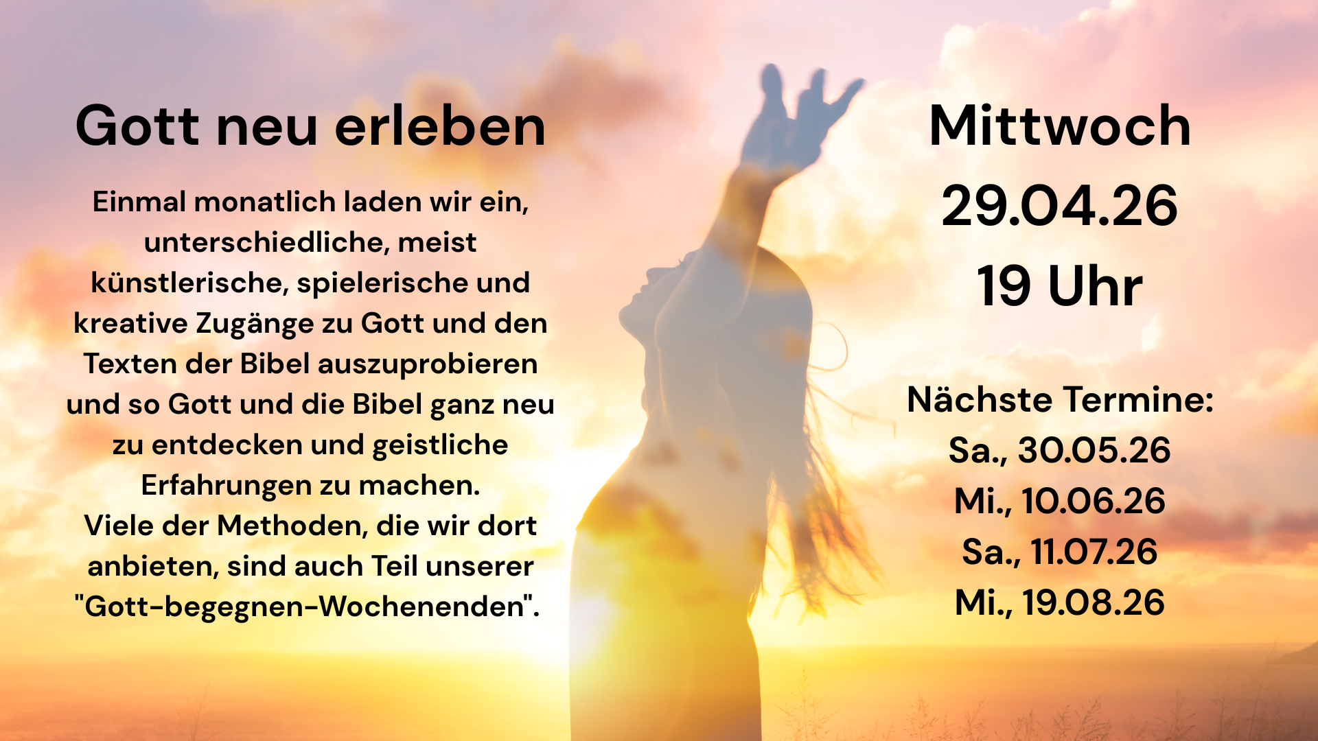 Apr 29 7:00 PM19:00 29.04.26, 19 Uhr: Gott neu erleben Wednesday, April 29, 2026 7:00 PM 8:30 PM 19:00 20:30 L4 - Evangelische Gemeinschaft Kassel e.V., Spendenkonto: DE59 5206 0410 0000 0014 65 (map) Google Calendar ICS View Event →