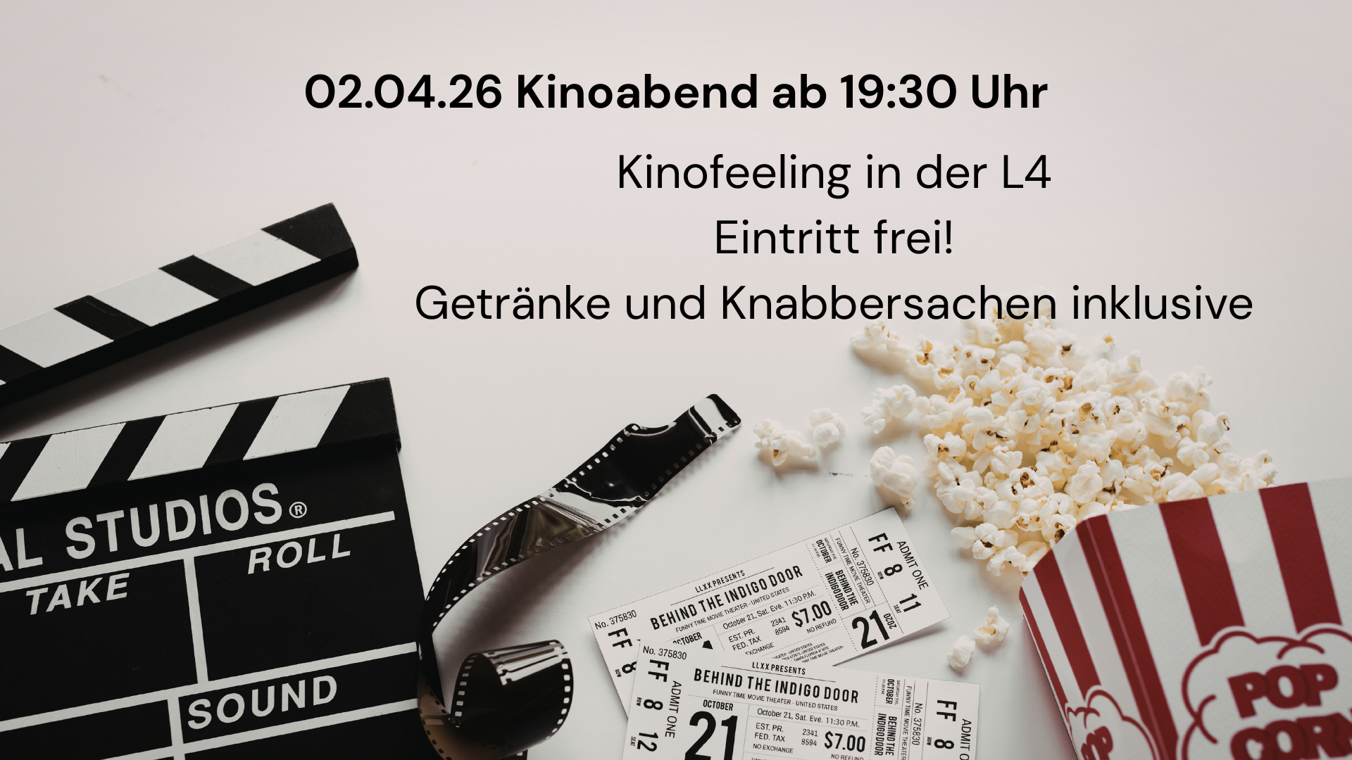 Apr 2 7:30 PM19:30 02.04.26, 19:30 Uhr: Kinoabend Thursday, April 2, 2026 7:30 PM 9:30 PM 19:30 21:30 L4 - Evangelische Gemeinschaft Kassel e.V., Spendenkonto: DE59 5206 0410 0000 0014 65 (map) Google Calendar ICS View Event →